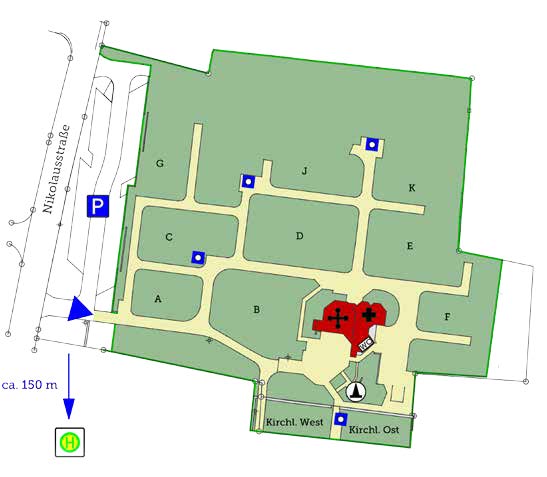 Der Plan dient der Orientierung auf dem Friedhof in Waldhausen bei der Suche nach vereinzelten Gräbern. Die einzelnen Abteilungen und ihre Bezeichnungen sind eingezeichnet.